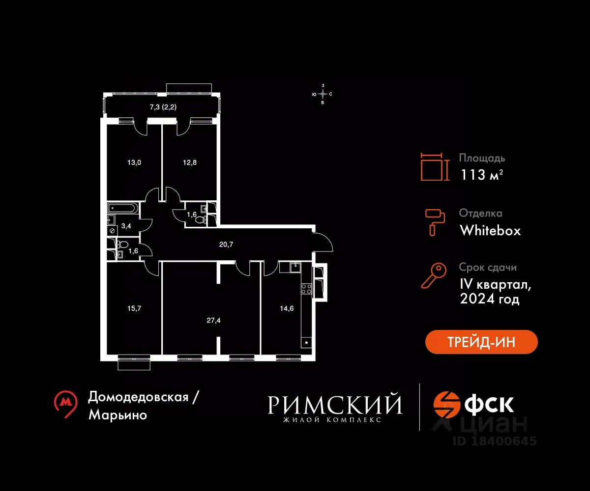 Максимальные скидки при 100% оплате. Готовый дом! Прямая продажа от застройщика! Жилой Комплекс класса Комфорт. Продаётся 4-к квартира номер 172 в сданном корпусе общей площадью 113 кв.м на 6-м этаже 10 этажного дома.