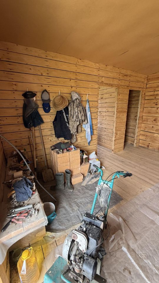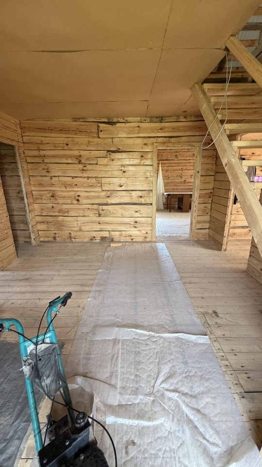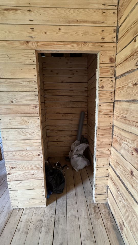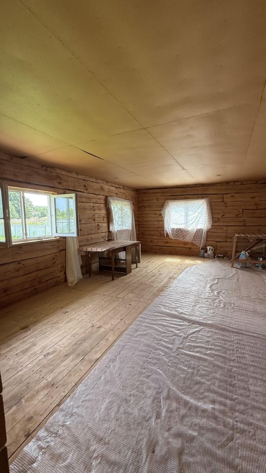 Материалы стен, полов , потолков натуральное дерево, в доме стоит шикарный благородный аромат! Стены из брянской сосны диаметром 36 см. (опиленной с внешней и внутренних сторон для удобства отделки) положены на мох.Ширина внутренних стен 15 см. Выстоян в течении 7 зим, затем пробит паклей. Отделан сайдингом с наружной стороны (светло- желтый) с устройством пароизоляции.