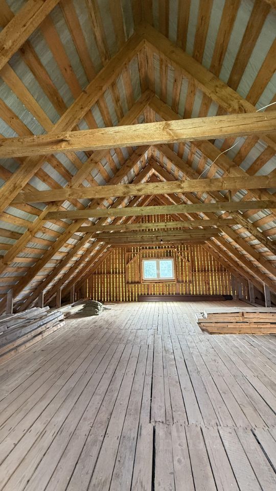 1-ый этаж (утепленный) в чистоте 9Х10 м с перерубом по длинной стене. Потолок (Н-2,7м.).2-й этаж мансарда 10х10 м свободной планировки, высота конька 5 м. Стропильная часть - брус 200Х70 мм. Крыша андулин (коричневый) с пароизоляционной подложкой. Окна стеклопакеты Rechau.