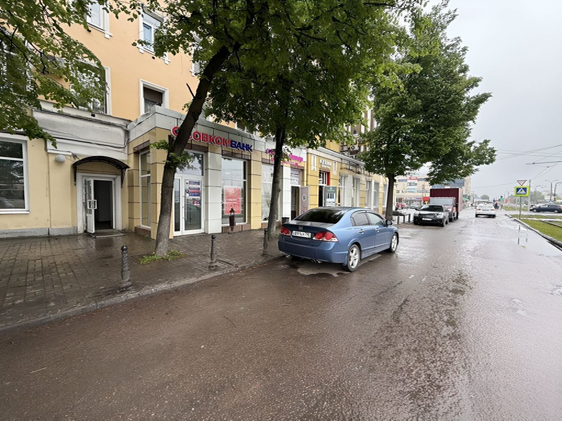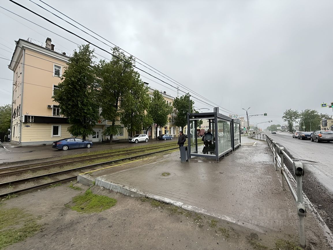 Первая линия главной улицы Коломны. Первый этаж жилого дома. Отдельный вход с улицы. Рядом остановка трамвая, через дорогу ж/д станция Голутвин, интенсивный пешеходный трафик.