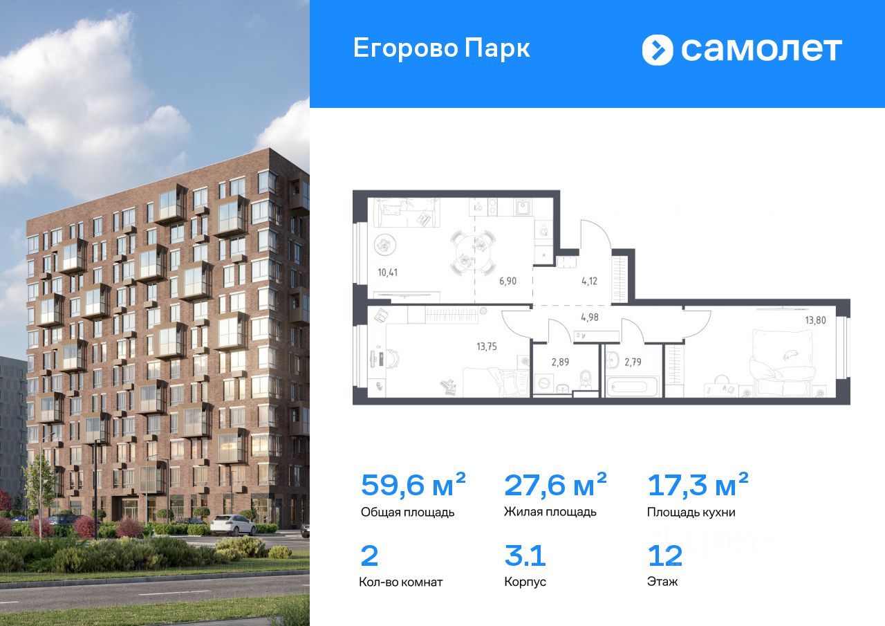 Строим кварталы для жизни с заботой о будущем. Предлагается 2-комнатная квартира комфорт-класса 59,64 кв.м в корпусе 3.1 на 12 этаже, в ЖК ''Егорово Парк''