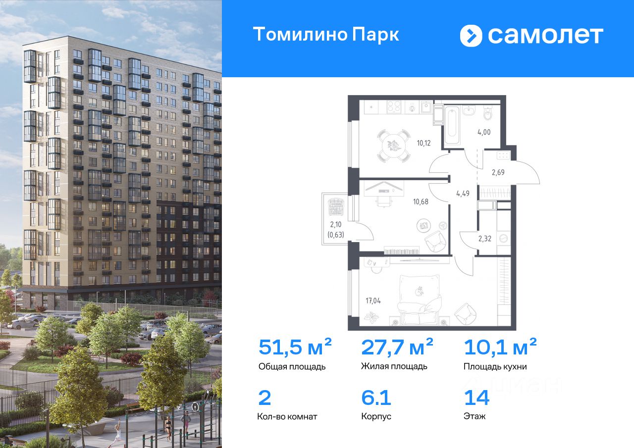 Строим кварталы для жизни с заботой о будущем. Предлагается 2-комнатная квартира комфорт-класса 51,5 кв.м в корпусе 6.1 на 14 этаже, в ЖК ''Томилино Парк'' Квартира с предчистовой отделкой. Доступность дополнительных опций уточняйте у застройщика.