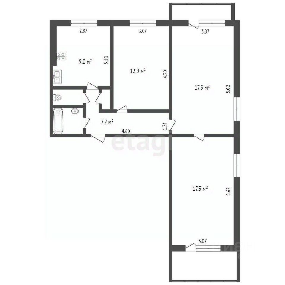Кухня площадью 9 м² станет отличным местом для кулинарных экспериментов. Две комнаты по 17.3 м² и одна — 13 м² предоставят достаточно пространства для комфортного проживания. Также есть лоджия и балкон. Квартира требует ремонта.